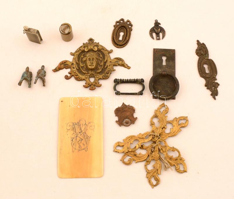 Beschreibung: Vegyes kis fém tétel: bútorveretek, zársapkák, ólomkatonák, stb., köztük több réz is, illetve 1 db műanyag, összesen 18 db, különböző méretben