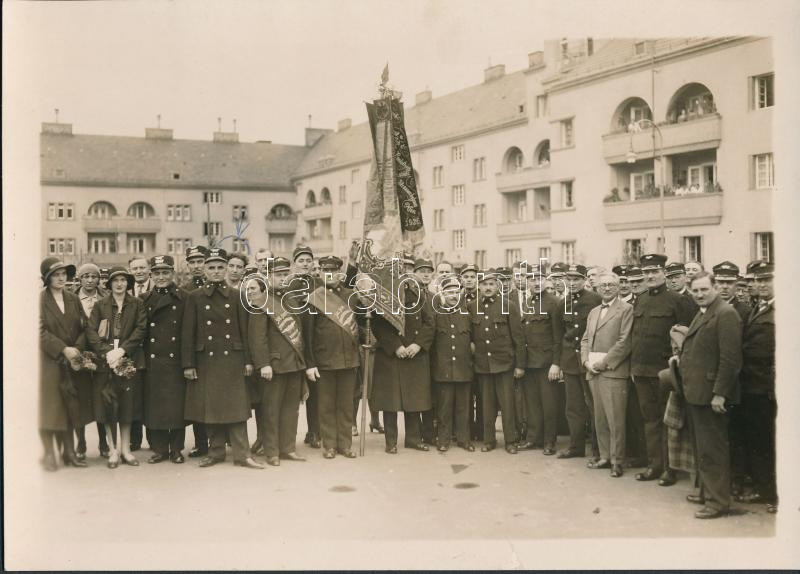 Beschreibung: 1931 Bécs(Wien), Spinnerin am Kreuz, egyleti gyűlés, hátoldalon feliratozott fotó, 13x18 cm / 1931 Vienna, Spinner am Kreuz, tableau, 13x18 cm