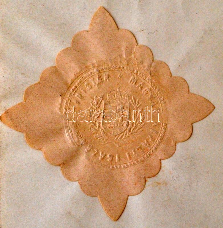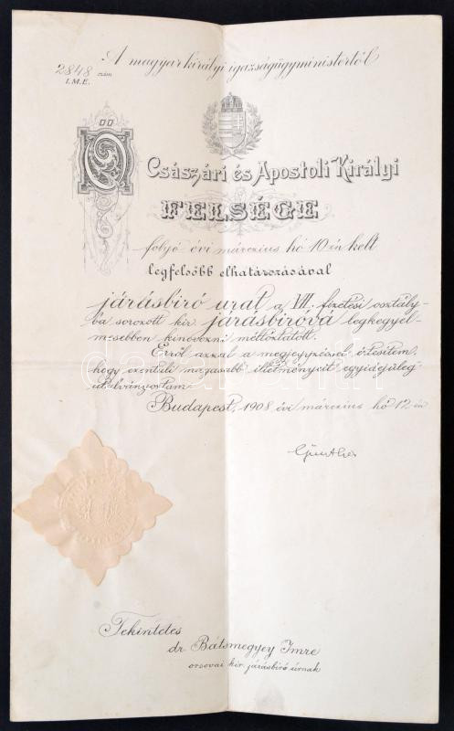 1908 VII. fizetési osztályba soroló királyi járásbírói kinevezés dr. Bátsmegyey Imrének Günther Antal (1847-1920) igazságügyminiszter aláírásával, szárazpecséttel, okmánybélyeggel, pecséttel.