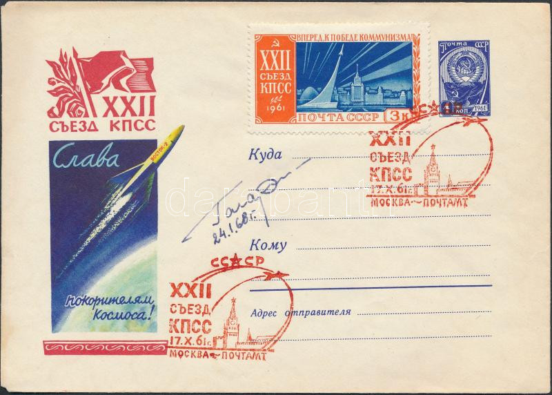 1968 Jurij Alekszejevics Gagarin (1934-1968) orosz űrhajós aláírása emlékborítékon, közel két hónappal halála előtt /