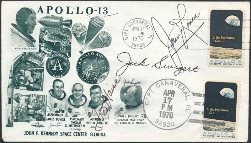 James Lovell (1928- ), Fred Haise (1933- ) és Jack Swigert (1931-1982) amerikai űrhajósok aláírásai emlékborítékon /