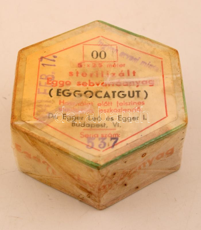1941 Eggocatgut, sterilizált Eggo sebvarróanyag, papírdoboz, 7×7×3 cm https://www.darabanth.com/de/273-Fernauktion/273.0/Andere-Sammelgebiete/Werbungen~39/1941-Eggocatgut-sterilizalt-Eggo-sebvarroanyag-papirdoboz-7C3977C3973-cm~II1390765