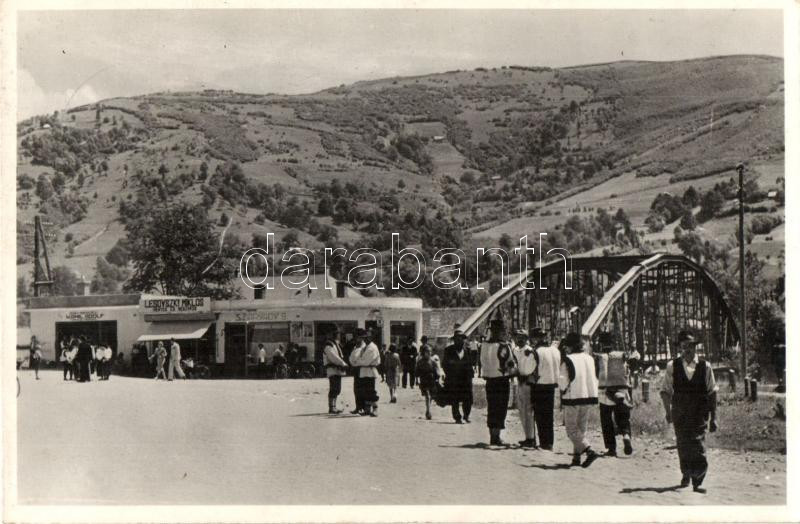 Beschreibung: Rahó, Rakhiv; 'Budapest' üdülő és turistaszálló, Fő utca, Tisza híd, Kamil Adolf, Lesovszky Miklós, Szarvady B. üzletei / holiday resort, bridge, shops