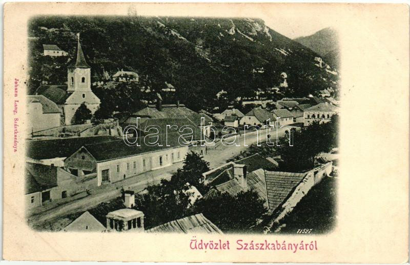 Beschreibung: Szászkabánya, Sasca Montana; Látkép, templom, kiadja Johann Lang / general view, church (Rb)