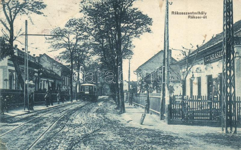 Beschreibung: Budapest XVI. Rákosszentmihály, Rákosi út, Hora János cukrászdája, villamos (EK)