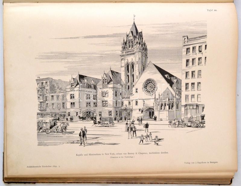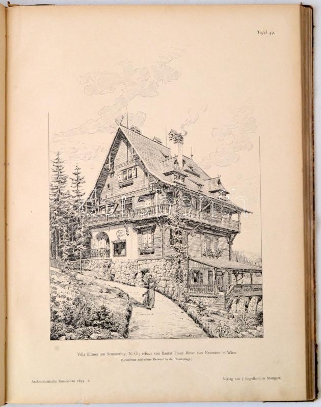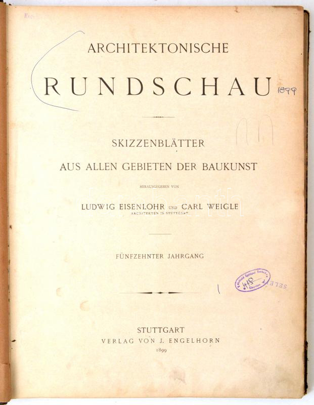 1899 Ludwig Eisenlohr-Car Weigle (szerk.): Architektonische Rundschau (Építészeti Szemle) 15. évfolyam. Stuttgart, 1899, J. Engelhorn. Korabeli félbőr kötés. Számos fekete-fehér szövegközti és egészoldalas ábrával, képpel illusztrálva. Német nyelvű építészeti folyóirat. A borítója kopottas, a címlapon tollal bejegyzés. Két tábla hátoldalán ceruzás rajzzal. Volt könyvtári példány. / Half-leather binding, in german language, with a lot of illustrations. The cover is worn.