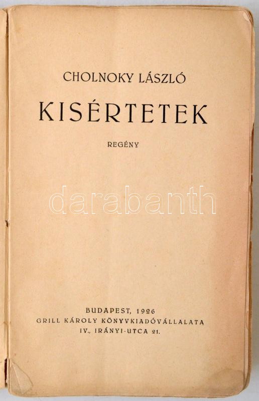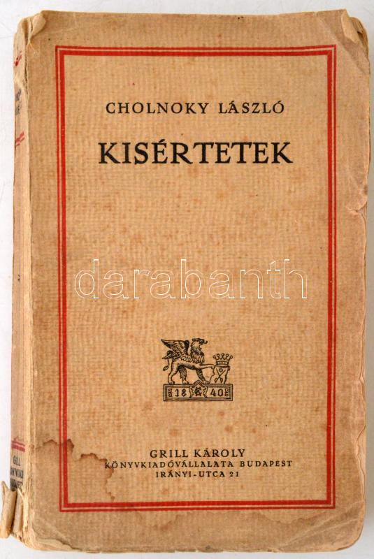 Cholnoky László: Kísértetek. Budapest, 1926, Grill Károly Könyvkiadóvállalata, 285 p. Első kiadás. Kiadói papírkötés. A borítója foltos, szakadozott. A gerince sérült. A kötése meglazult, a lapok foltosak. A 275-285 p. között a lapok kijárnak.