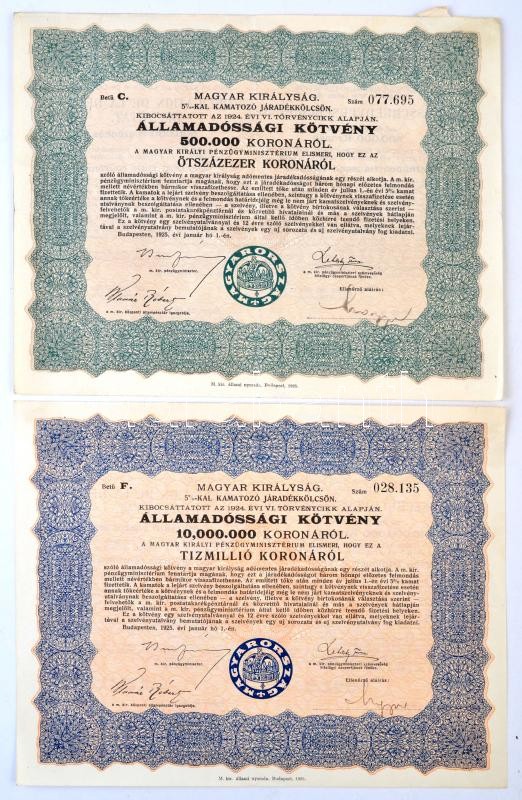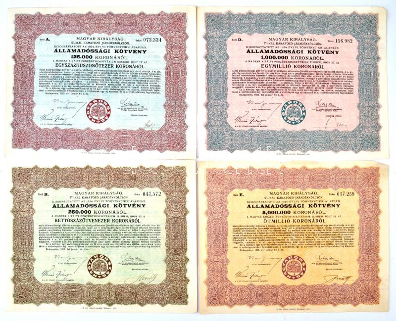 Budapest 1925. "Magyar Királyság 5%-kal kamatozó Járadékkölcsön Államadóssági Kötvény" 125.000K, 250.000K, 500.000K, 1.000.000K, 5.000.000K és 10.000.000K-ról szelvények nélkül T:II-III