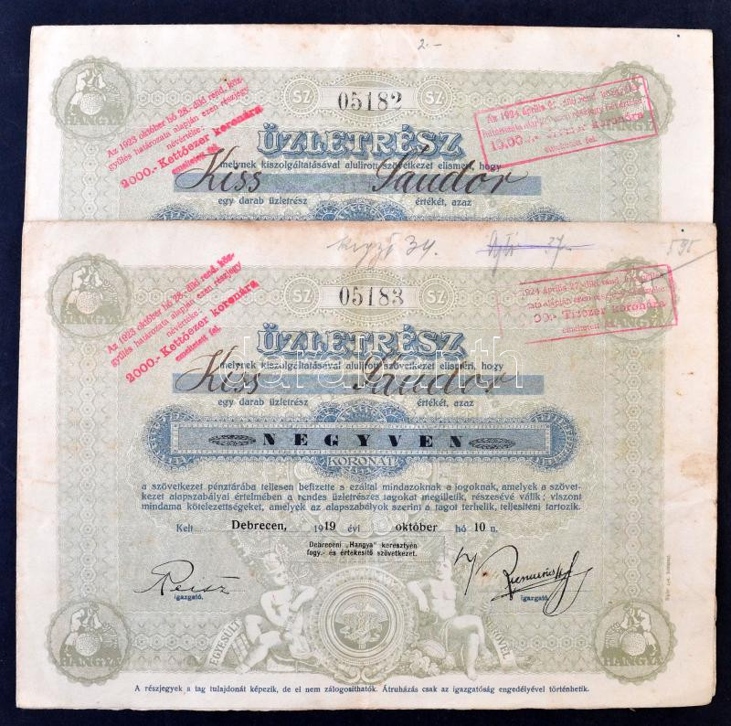 Beschreibung: Debrecen 1919. "Debreceni 'Hangya' Keresztyén Fogyasztási és Értékesítő Szövetkezet" üzletrészjegye szelvényekkel, bélyegzésekkel (2x) T:III