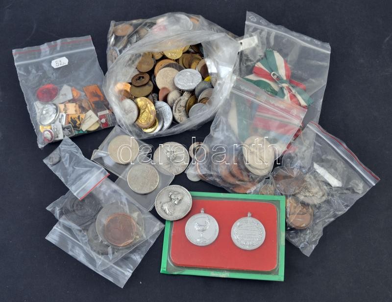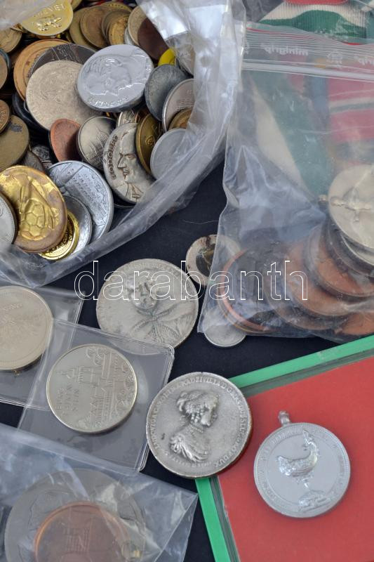 Vegyes magyar és külföldi érme, emlékérem, sportérem, zseton, jelvény, replika tétel 2kg-os súlyban, közte szalagok, szocialista jelvények, sportérmek T:vegyes