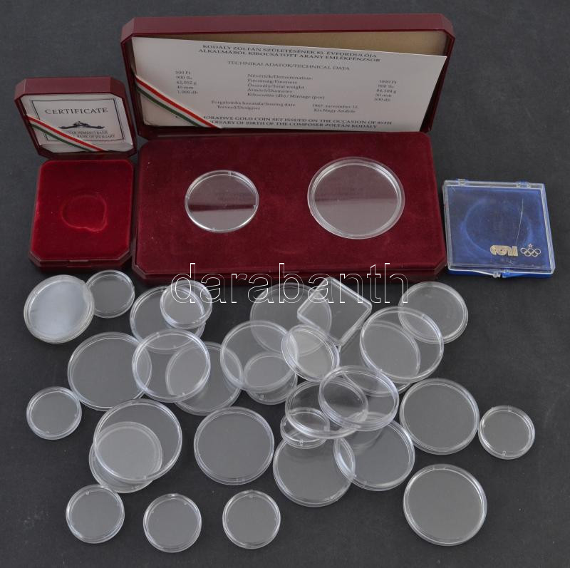 Beschreibung: Vegyes, használt kellék tétel: három darab éremtartó tok (egyiken repedés) valamint 30db érmekapszula, közte négyzetes és ovális kialakítású is