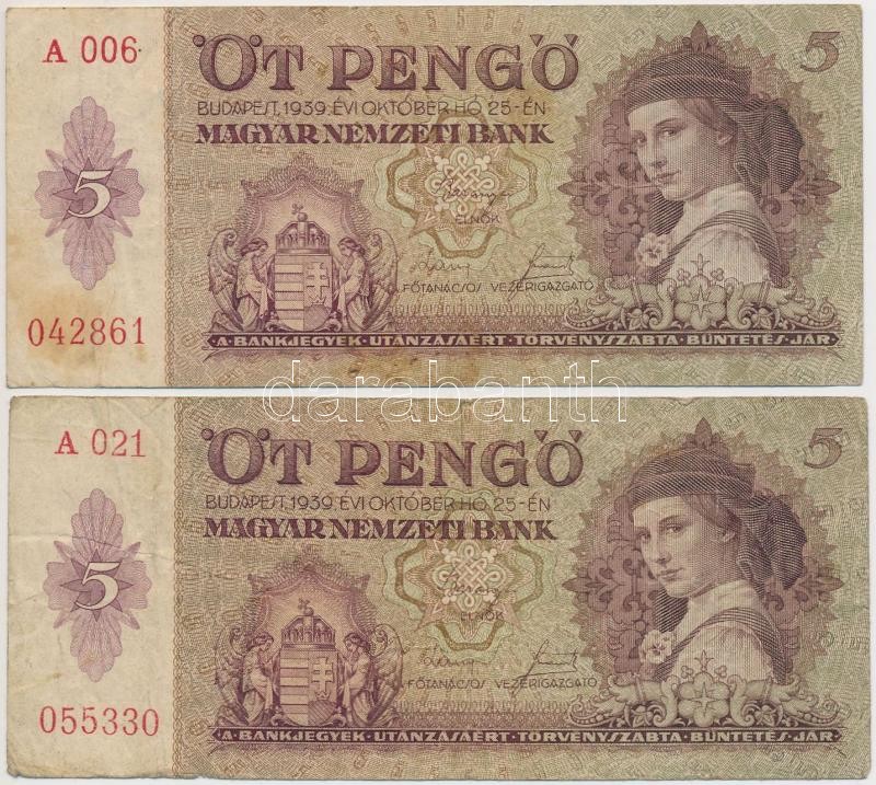 1930. 20P (3x) + 1939. 5P (2x) T:III,III- https://www.darabanth.com/de/273-Fernauktion/273.0/Numismatik/Ungarische-Banknoten~300008/1930-20P-3x-plus-1939-5P-2x-TIII-III-~II1393602