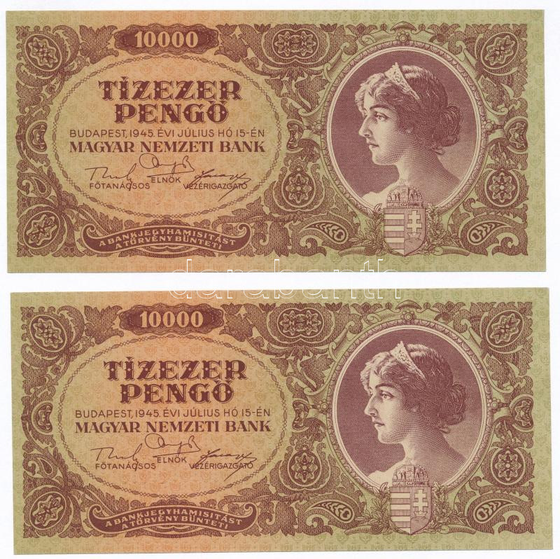 1945. 10.000P (2x) sorszámkövetők, mindkettő "MNB" bélyeg nélkül T:I,I... https://www.darabanth.com/de/273-Fernauktion/273.0/Numismatik/Ungarische-Banknoten~300008/1945-10000P-2x-sorszamkovetok-mindketto-MNB-belyeg-nelkul-TI-I-~II1392068