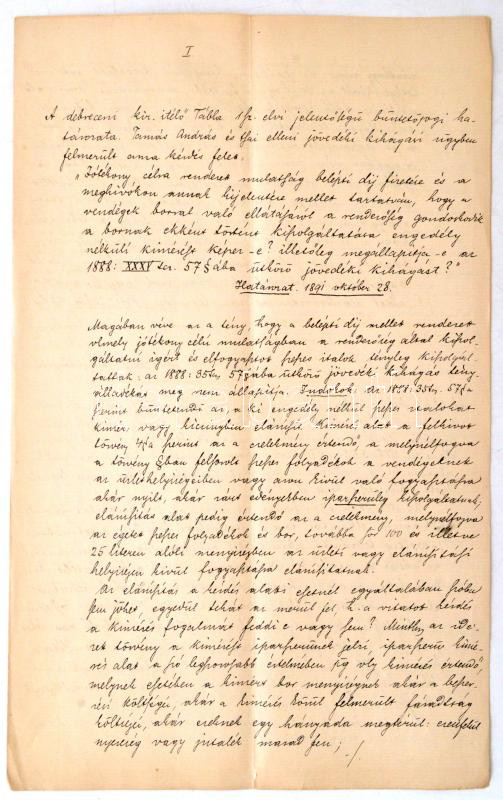 Beschreibung: 1891 A debreceni kir. ítélő tábla által hozott büntetőjogi határozat