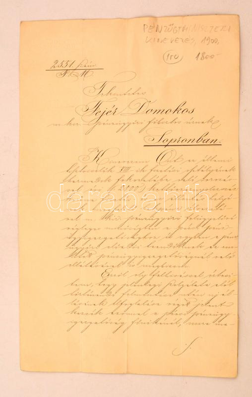 1900 Bp., A magyar királyi pénzügyminiszter által kiadott pénzügyőri k... https://www.darabanth.com/de/274-Fernauktion/274.0/Andere-Sammelgebiete/Dokument~16/1900-Bp-A-magyar-kiralyi-penzugyminiszter-altal-kiadott-penzugyori-kinevezesrol-szolo-o~II1400148