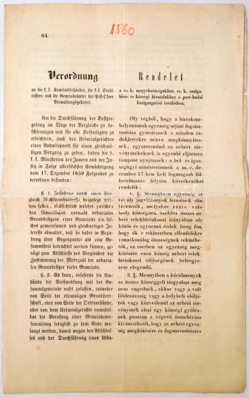 1860 Az Úrbéri rendelet végrehajtása tárgyában született rendelet a Pe... https://www.darabanth.com/de/274-Fernauktion/274.0/Andere-Sammelgebiete/Drucksachen~28/1860-Az-Urberi-rendelet-vegrehajtasa-targyaban-szuletett-rendelet-a-Pest-Buda-kornyeki-fol~II1400115
