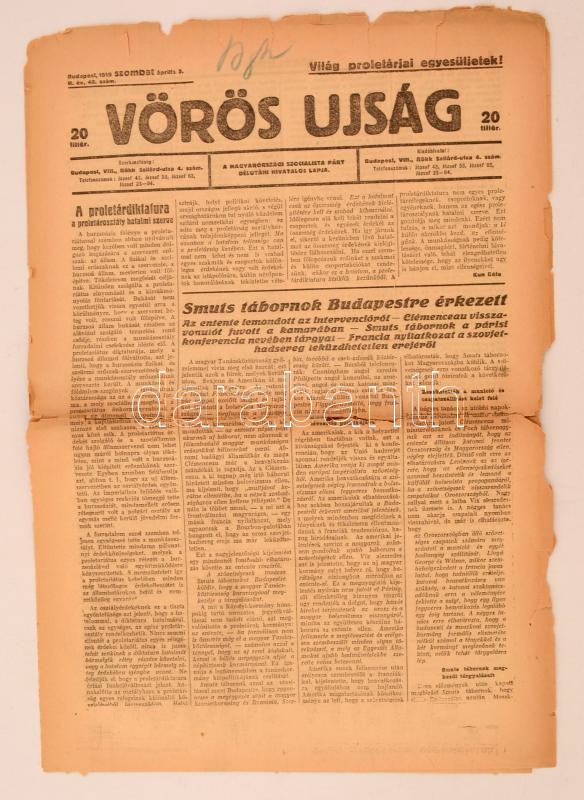 1919 Vörös Ujság, a Magyarországi Szocialista Párt délutáni hivatalos ... https://www.darabanth.com/de/274-Fernauktion/274.0/Andere-Sammelgebiete/Drucksachen~28/1919-Voros-Ujsag-a-Magyarorszagi-Szocialista-Part-delutani-hivatalos-lapja-II-evfolyam-4~II1400536