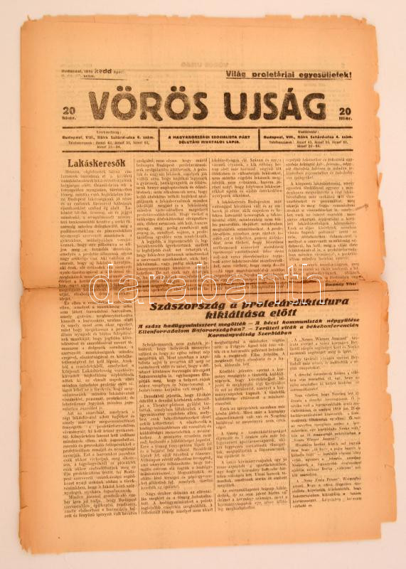 1919 Vörös Ujság, a Magyarországi Szocialista Párt délutáni hivatalos ... https://www.darabanth.com/de/274-Fernauktion/274.0/Andere-Sammelgebiete/Drucksachen~28/1919-Voros-Ujsag-a-Magyarorszagi-Szocialista-Part-delutani-hivatalos-lapja-II-evfolyam-5~II1400524