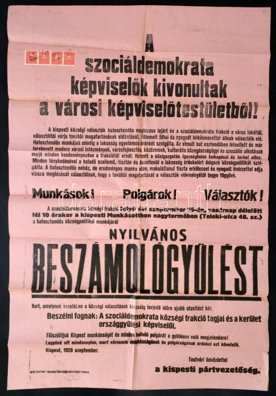 1928 Szociáldemokrata politikai plakát, a kispesti szociáldemokraták felhívása a helyi munkásokhoz, polgárokhoz hivatalos beszámológyűlés ügyében, a hajtásoknál néhol szakadt, okmánybélyegekkel, 92x62 cm.