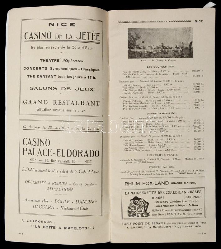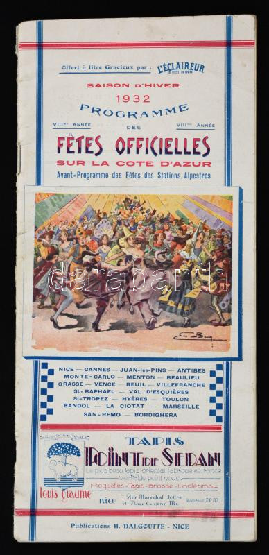 1932 Saison D'Hiver Programme Des A Fetes Officielles Sur La Cote D'Azur. Nice (Nizza), H. Dalgoutte. Francia nyelvű műsorfüzet, reklámokkal, fekete-fehér képekkel, sok érdekes adattal, viseltes papírkötésben.