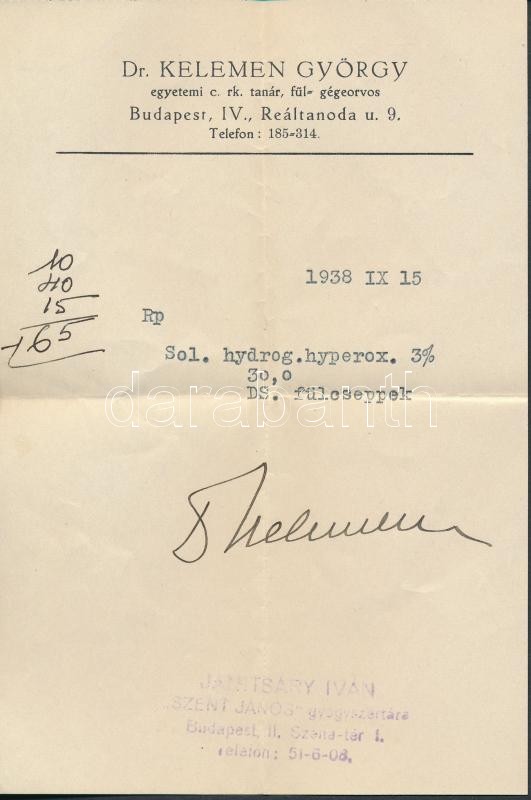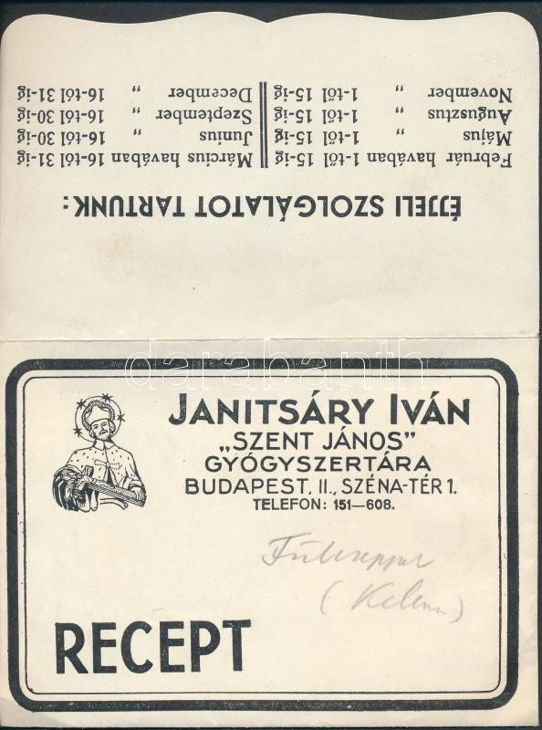 1938 Janitsáry Iván Szent János gyógyszertára, receptboríték fülcsepp ... https://www.darabanth.com/de/274-Fernauktion/274.0/Andere-Sammelgebiete/Drucksachen~28/1938-Janitsary-Ivan-Szent-Janos-gyogyszertara-receptboritek-fulcsepp-recepttel-115C3978-cm-~II1399655