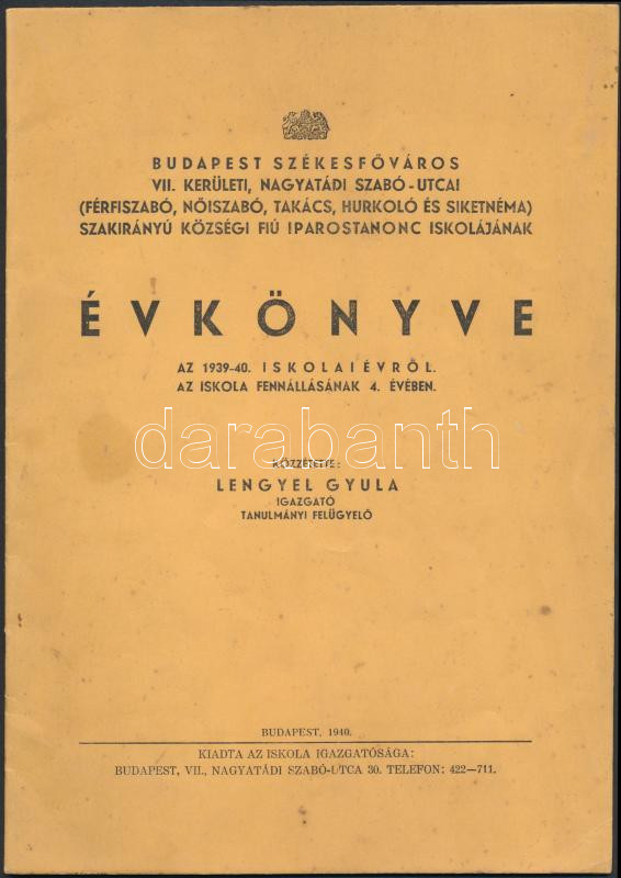 1940 A budapesti VIII. kerületi Nagyatádi Szabó utcai iparostanonc iskolájának 1939-1940. évi évkönyve, Közzétette: Lengyel Gyula. Bp., iskolaigazgatóság. Papírkötésben, jó állapotban, 24 p.