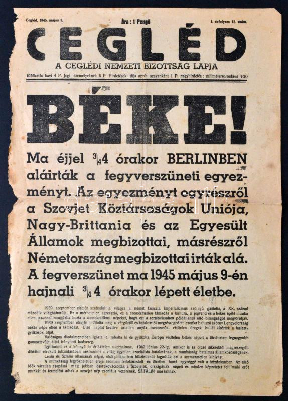 Beschreibung: 1945 Cegléd, a ceglédi Nemzeti Bizottság lapjának 1. évf. 12. száma (május 9.) az európai békekötés hírével