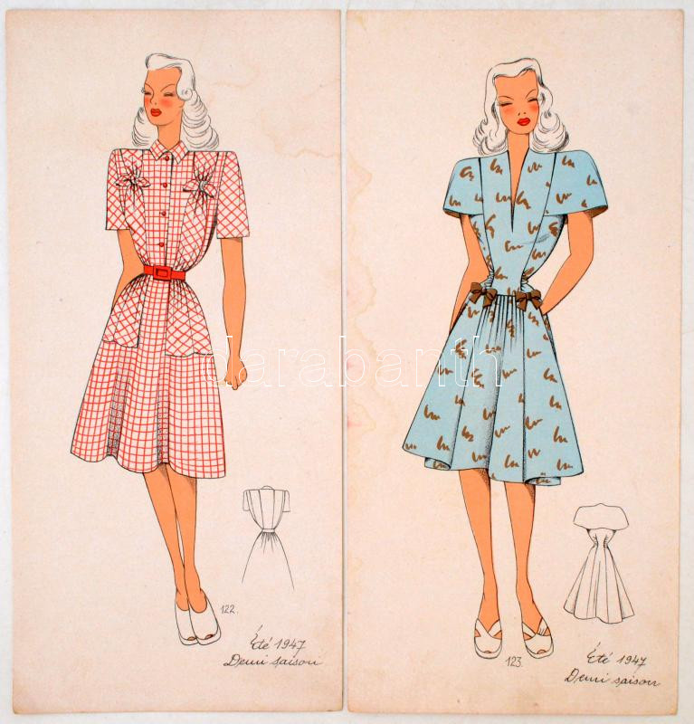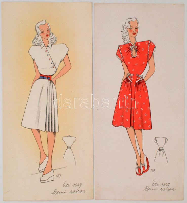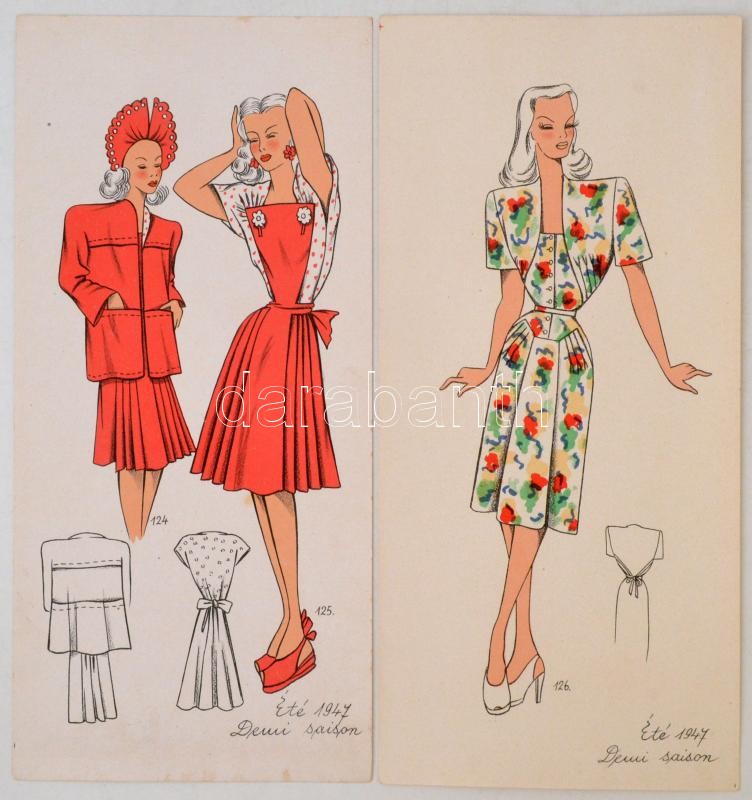 1947 Női divat, jelzés nélküli színes nyomtatott divatrajzok papírtokban, 27 db (14 cm × 30 cm) / Editions de Secrets Beauté de la Mode; fashion illustrations