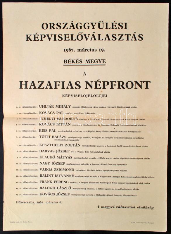 1967 Országgyűlés Képviselőválasztás plakátja, a Békés megye választók... https://www.darabanth.com/de/274-Fernauktion/274.0/Andere-Sammelgebiete/Drucksachen~28/1967-Orszaggyules-Kepviselovalasztas-plakatja-a-Bekes-megye-valasztokeruletben-indult-~II1396909