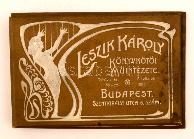 cca 1900 Leszik Károly Könyvkötői Műintézetének szecessziós borítójú í... https://www.darabanth.com/de/274-Fernauktion/274.0/Andere-Sammelgebiete/Drucksachen~28/cca-1900-Leszik-Karoly-Konyvkotoi-Muintezetenek-szecesszios-boritoju-irotombje-hasznC3~II1400346