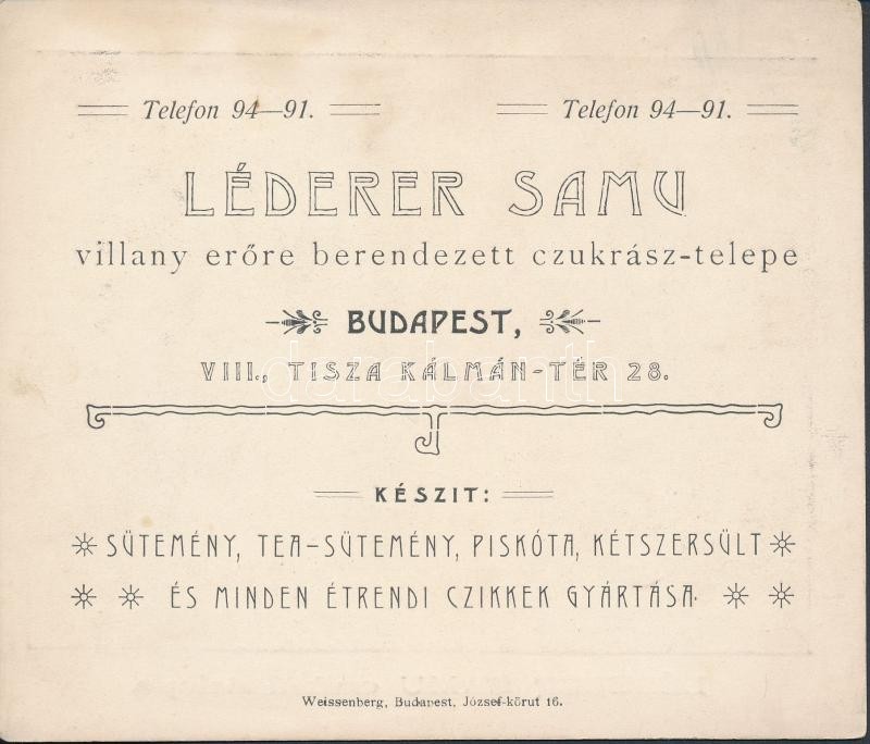 cca 1905 Léderer Samu budapesti cukrásztelepe, reklámlap / old adverti... https://www.darabanth.com/de/274-Fernauktion/274.0/Andere-Sammelgebiete/Drucksachen~28/cca-1905-Lederer-Samu-budapesti-cukrasztelepe-reklamlap-old-advertising-card-of-a-Hungarian-co~II1399924