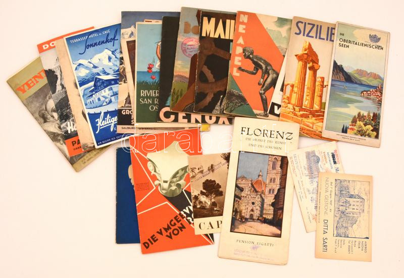 cca 1930 23 db. olaszországi utazási brosúrák(pl: Milano, Firenze, Bologna, Velence, Toszkána, Capri, Szicília, Nápoly, ..stb.) , több nyelven, változó méretben, és állapotban.