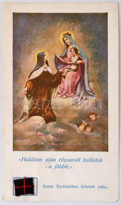 cca 1930 "Szent Terézkéhez érintett ruha" ereklyés szentkép, 11x6cm https://www.darabanth.com/de/274-Fernauktion/274.0/Andere-Sammelgebiete/Drucksachen~28/cca-1930-Szent-Terezkehez-erintett-ruha-ereklyes-szentkep-11x6cm~II1396616