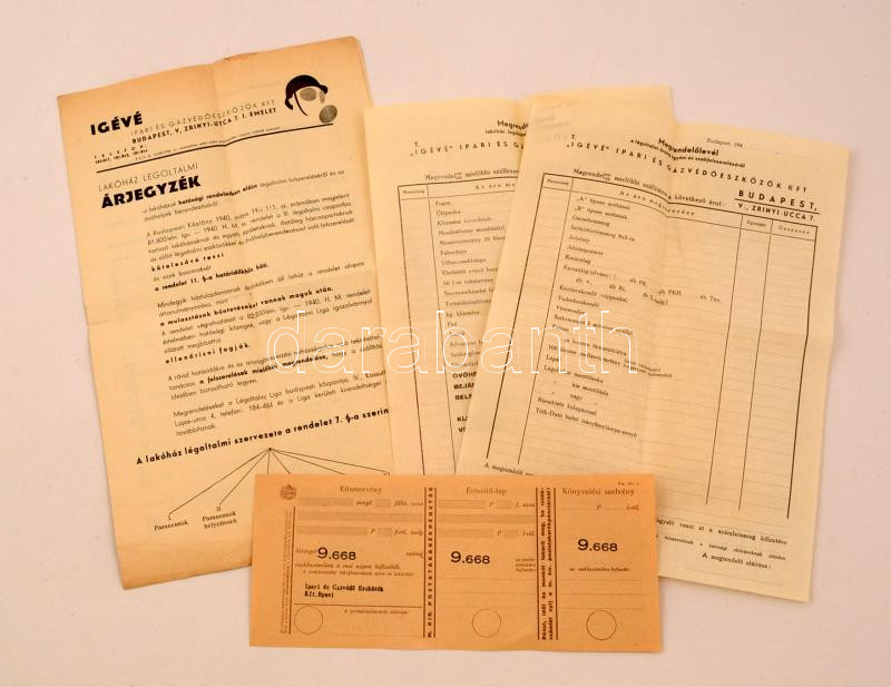 cca 1940-1950 Légoltalmi eszközökkel kapcsolatos megrendelőívek, árjeg... https://www.darabanth.com/de/274-Fernauktion/274.0/Andere-Sammelgebiete/Drucksachen~28/cca-1940-1950-Legoltalmi-eszkozokkel-kapcsolatos-megrendeloivek-arjegyzekek-4-db~II1399882
