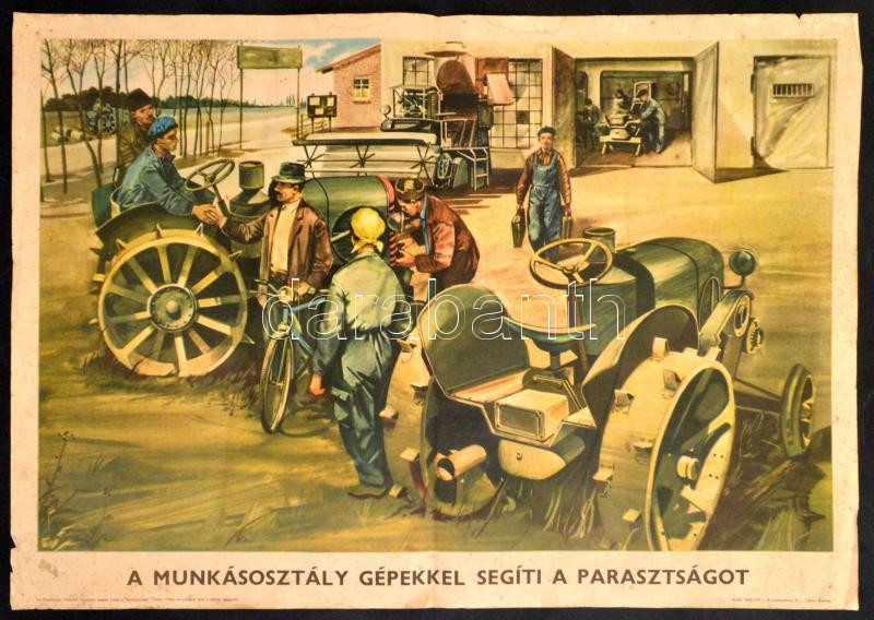 Beschreibung: cca 1960 A munkásosztály gépekkel segíti a parasztságot, némileg megviselt állapotban, foltos, a sarkainál gyűrött szakadozott, 50x70 cm.