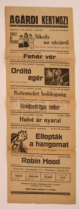 cca 1960 Az Agárdi Kertmozi műsoros plakátja, hajtott, szakadással, 84... https://www.darabanth.com/de/274-Fernauktion/274.0/Andere-Sammelgebiete/Drucksachen~28/cca-1960-Az-Agardi-Kertmozi-musoros-plakatja-hajtott-szakadassal-84x29-cm~II1399914