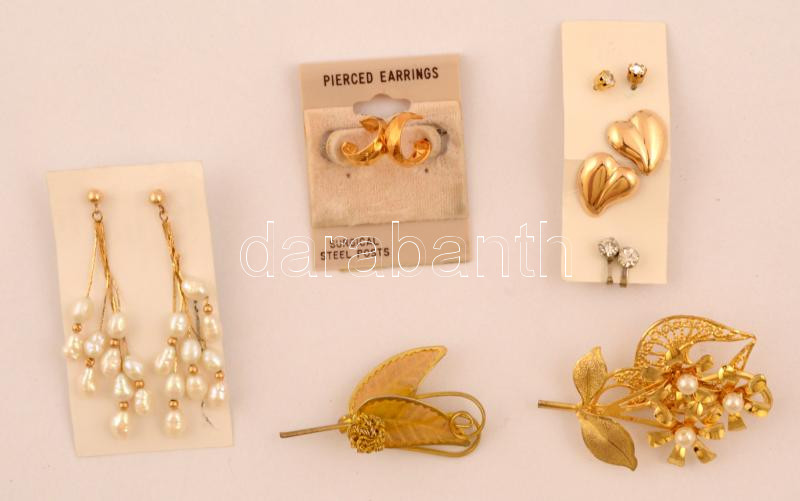Beschreibung: Arany színű bizsu tétel, strasszokkal, gyöngyökkel, 7 db(fülbevalók, brossok)