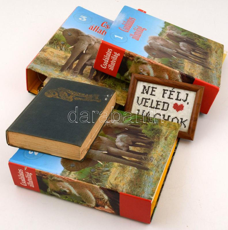 Beschreibung: Bolha tétel: a Csodálatos állatvilág 3 mappája; Ne félj, veled vagyok hímzés üvegezett keretben(8x12 cm), Hun-magyar mondák című könyv
