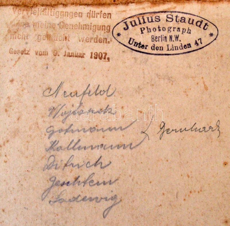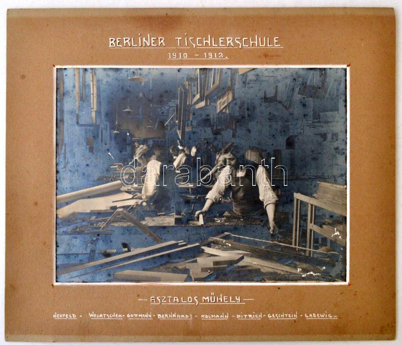 1912 Berlini asztalosműhely. Nagyméretű fotó rajta magyar inasok, mesterek aláírásaival, paszpartuban. / 1912 Berlin carpenter workshop large photo in paspartu 32x27 cm
