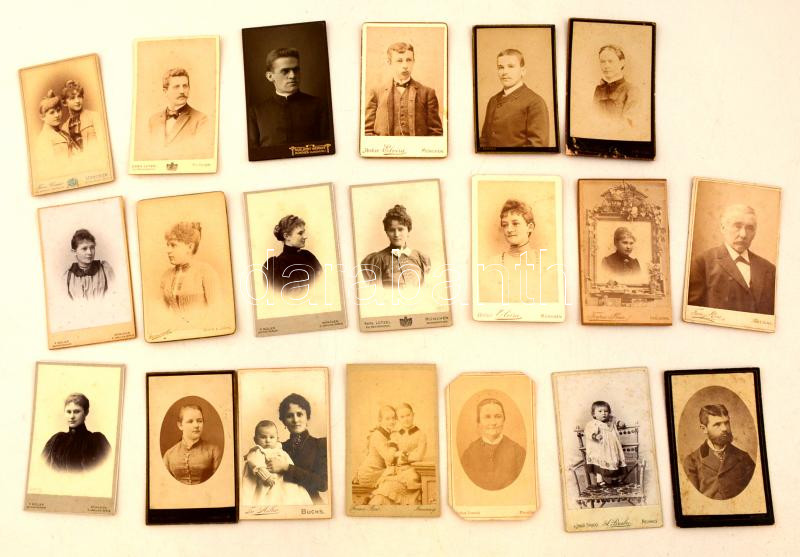 Beschreibung: cca 1884-1910 Vegyes női, férfi és gyermek keményhátú műtermi portréfotó tétel, 20 db különböző műtermekből, 10x6 cm