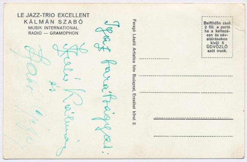 cca 1930 Excellent Trio, fotólap, a hátoldalán Szabó Kálmán és Szabó G... https://www.darabanth.com/de/274-Fernauktion/274.0/Andere-Sammelgebiete/Foto~19/cca-1930-Excellent-Trio-fotolap-a-hatoldalan-Szabo-Kalman-es-Szabo-Geza-altal-alairt-~II1398383