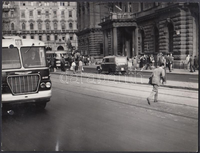 Beschreibung: cca 1962 Budapest, 19-es autóbusz a Nemzeti Színháznál, a képen 2 lyuk található, valószínűleg lefűzés nyomai, vintage fotó, 18x24 cm