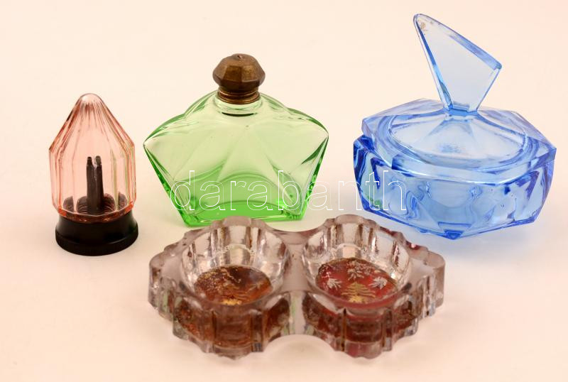 Beschreibung: Vegyes kis üvegtétel: cukortartó, ékszertartó, tároló üvegcsék, jelzés nélkül, , nagyon apró lepattanásokkal, különböző méretben