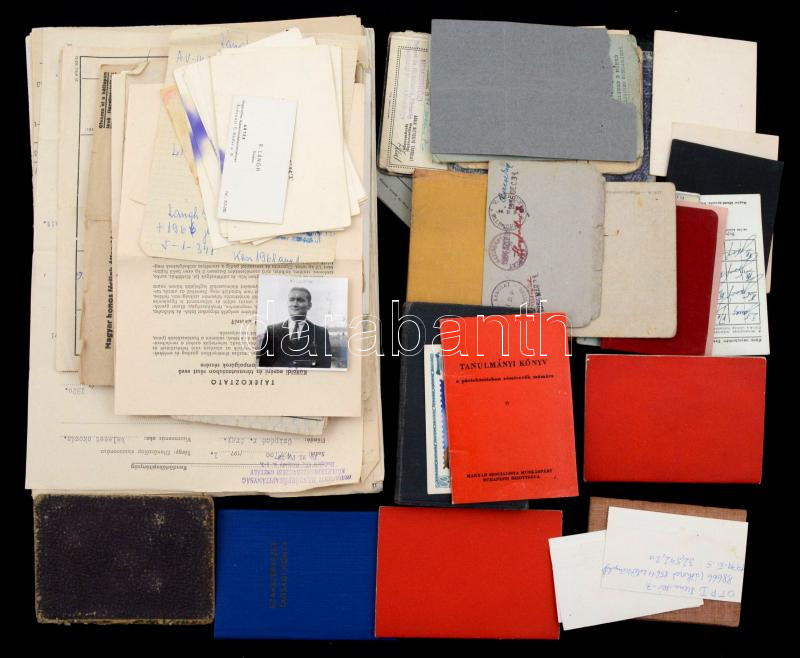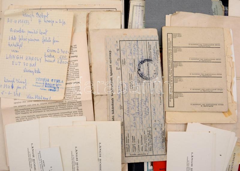 cca 1941-1977 Lángh Róbert (1920-?) biztosítói titkár, későbbi rendőr főhadnagy, majd vállalati tisztviselő irathagyatéka: önéletrajzok, válási kereset, párttagkönyvek, igazolványok, névjegyek, igazolások, emléklap, biztosítási kötvény, stb.