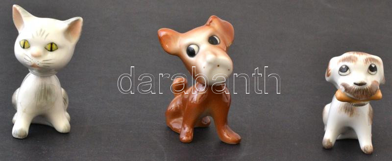 Beschreibung: 3 db bólogatós porcelán figura (2 kutya, 1 macska), köztük 2 db Aquincumi, kézzel festettek, jelzettek, sérültek, különböző méretben
