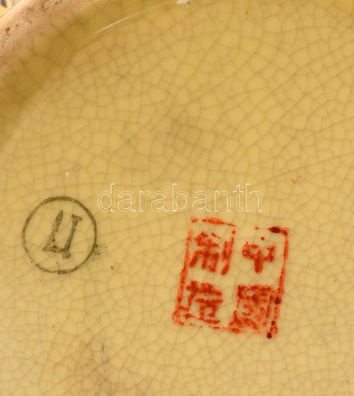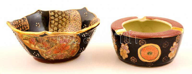 Kínai porcelán hamutál, kézzel festett, jelzett, kopásnyomokkal, d: 11,5 cm + kínai porcelán tálka, kézzel festett, jelzett, kis kopásnyomokkal, d: 14,5 cm
