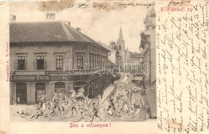 Nagyvárad, Oradea; "Jön a villanyos!" humoros montázslap, Auslander Berta, Czillér Imre és Lojanek J. üzlete, villamos / shops, tram, humorous montage (EK)