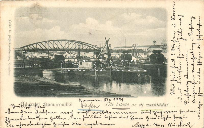 Beschreibung: 1899 Komárom, Komárno; Téli kikötő az új vashíddal, kiadja Czike D. / winter port with the new iron bridge
