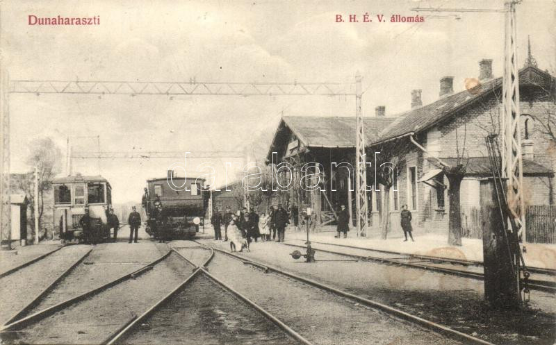 Beschreibung: Dunaharaszti, Budapest Helyiérdekű Vasút (BHÉV) állomás, vonat, kiadja Kulikov J. Nándor
