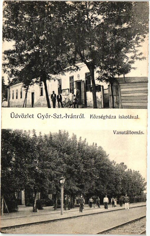 Győrszentiván, Községháza, iskola, vasútállomás, kiadja Ősz Vilmos https://www.darabanth.com/de/274-Fernauktion/274.0/Ansichtskarten/Ungarn~400006/Gyorszentivan-Kozseghaza-iskola-vasutallomas-kiadja-Osz-Vilmos~II1400022